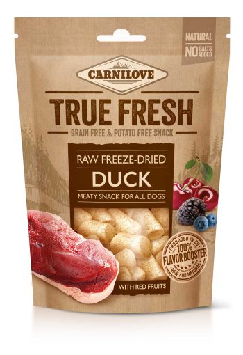 חטיף מיובש בהקפאה ע"ב ברווז עם 5 סוגי פירות אדומים. מזון משלים חטיף לכלבים בוגרים. הרכב: ברווז 90% (בשר עם עצמות, כבד ולבבות טחונים דק), 5 סוגי פירות אדומים 4% (דובדבנים חמוצים, אסנה, פטל, אוכמניות ודומדמניות), סיבי אפונה, תערובת טוקופרולים (חומרים משמרים טבעיים), ריח צמחי, שמרים. מדריך האכלה: הגישו מדי יום יחד עם מזון יבש כמגביר טעם,כפרס או לאימון בעזרת הנעה חיובית, או ברגעים משותפים במהלך היום. ודא שלידידך הכלב יש תמיד מי שתייה טריים בכמות מספקת. הרכב תזונתי: חלבון גולמי 33.0%, שומן גולמי 37.0%, סיבים גולמיים 5.0%, אפר גולמי 8.9%, לחות 4.0%, סידן 2.6%, זרחן 2.1%.